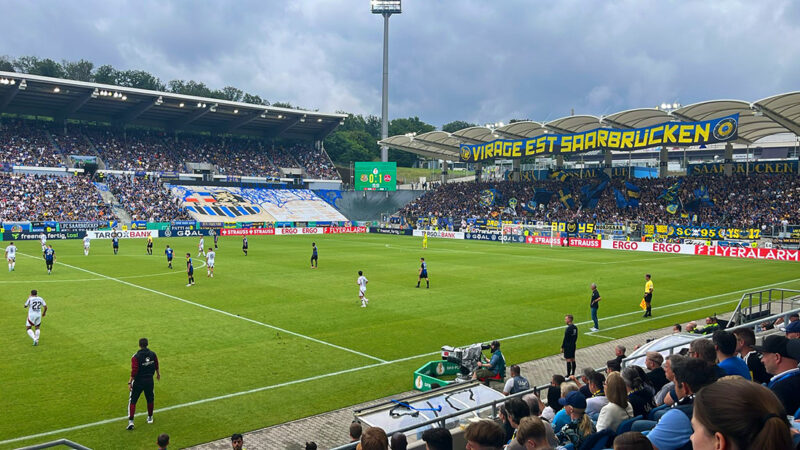 So, das war die erste brenzlig Situation für Saarbrücken. Gut gehalten von Mathenia. Jetzt kommt das Stadion. Nachtigall ick hör dir trapsen….
