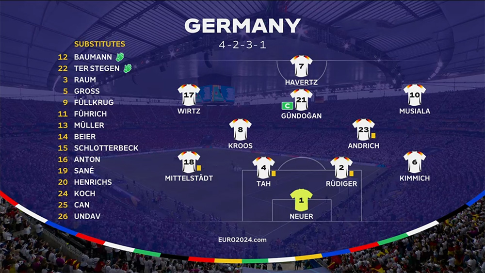 Das Tor fiel dann auf der anderen Seite, nach schnellem Gegenstoß der lauernden Schweizer und schöner Direktabnahme des auffälligen Ndoye. Das VAR dann ein Tor, eine deutsche Fußspitze hob das Abseits auf. Die bei der EM praktizierte halbautomatische Abseitskontrolle gefällt mir übrigens sehr gut, durch den Sensor im Ball gibt es auch keinen Interpretationsspielraum beim Abspielzeitpunkt und die Grafik ist sehr anschaulich.