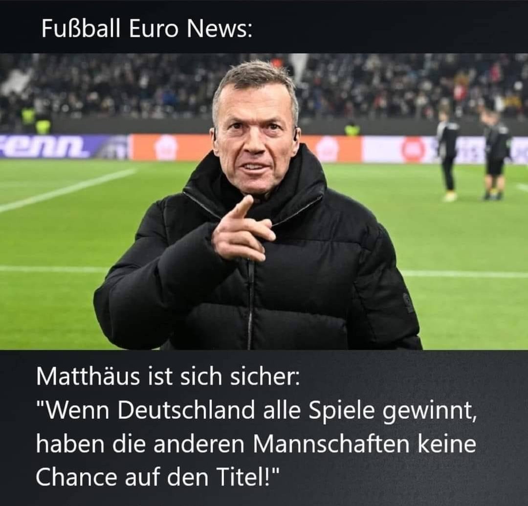 Also rein logisch gibt es an der Aussage von Lodda nix auszusetzen. Wo er Recht hat, hat er Recht. Muss man auch mal sagen. Und mit dieser Aussage rettet er auch Deutschland. Einfache Gebrauchsanleitung für Nagelsmann. Gewinnt einfach alle Spiele, dann werdet Ihr Europameister. Ja, so ist das.