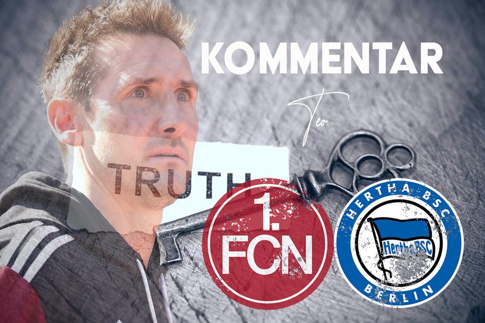 Den Schuh ziehe ich mir an, ich habe letzte Woche einen sehr positiven Artikel geschrieben fern davon über die Trainerposition zu diskutieren oder jetzt schon in Frage zu stellen. Daran hätte auch eine Niederlage gegen Hertha im Grunde nichts geändert, die nochmal einen anderen Kader haben als wir. Spieler wie Maza, Scherhant, Zeefuik haben wir einfach nicht, aber man bekommt gnadenlos vor Augen geführt, dass bei der Hertha unter Fiel, der solange in Berlin ist wie Klose in Nürnberg oder sollte man sagen auch nicht länger dort ist. Jeder Hertha Spieler hatte eine Funktion und einen Plan. Das gesamte Team hatte einen Matchplan, dem sich jeder Spieler verschrieben hat diesen zu erfüllen, selbst ein Systemwechsel 2. Halbzeit um Zeit von Uhr zu kriegen haben die Herthaner mühelos umgesetzt den Nürnbergern den Ball zu lassen und auf umschalten zu lauern , jeder Spieler hat sich den Vorgaben untergeordnet. Und beim Club siehst du bei jedem Spieler diese Ratlosigkeit, was er tun soll. Einer führt den Ball die anderen traben oder stehen herum obwohl das Thema nach jedem Spiel angesprochen wird ohne Ball in die richtigen Positionen laufen, Anspieloptionen bieten. Nichts ändert sich nach immerhin auch schon 7 Pflichtspielen.